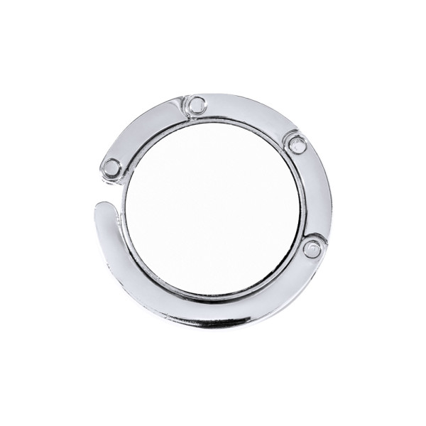Klappbarer Handtaschenhalter aus Metall mit Kunstledereinsatz in leuchtenden Farben. Präsentiert in einer individuellen Box mit Stanzung im Inneren.